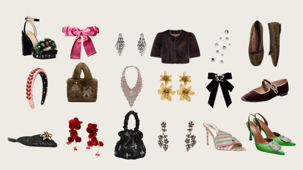 19 luxe for less under $200 statement accessories This roundup is the less absurd followup to this article. It’s the same idea though, with more approachable options. Build a quiet base, then add one under-$200 statement accessory, like chandelier earrings, a bold necklace, a festive clutch, or standout flats/heels. Echo its color or texture somewhere else, like your nails or lips. Save the final outfit in a Collection and your future you will thank you, instead of mentally spiraling and convincing yourself that you don’t have any party outfits… so you panic shop, and buy something you don’t love, etc, etc. You know the drill. Statement Shoes Crystal-buckle flats or satin heels deliver festive energy without sacrificing your budget (or comfort in the case of flats). Bow-detailed ballet flats or low mules work when heels aren’t an option—sparkle plus stamina. Pair with jeans or a slip skirt for easy party outfit polish. Statement bag & clutch A fluffy textured bag acts like jewelry you carry—pair with a black turtleneck, straight jeans, and slingbacks for effortless party outfit polish. Keep the rest simple; let the bag do the talking. Statement belt A rhinestone bow belt turns a blazer-and-denim combo or little black dress into instant sparkle. Cinch it at the waist and let the bow be the focal point. A formerly “nice” (predictable? boring?) oufit becomes party-ready in one move. Bonus, the pink can be worn year round. Statement jewelry A waterfall necklace lays flat under button-downs or against bare skin; pair with denim and a blazer for instant polish. Choose earrings that contrast your hair color so they can be seen better. Hair bows & finishing touches Clip a velvet crystal bow to a low ponytail. Add a headband to dry powdered hair. That single sparkle reads polished without trying. I love the hair magnets so much. They are my favorite find because they’re so unexpected and impactful. You just don’t see them often! $170 FITTED BLAZER ZW COLLECTION LIMITED EDITION Take me there $168 Tuckernuck Black Ponte Ashford Pants Take me there $60 SHINY FAUX FUR HANDBAG Take me there $165 Suryo Sula Mini Dumpling Satchel Take me there $79 This is absolute genius. The color means it could be a party piece for the entire year, not just Christmas and Valentine’s Day. I love this belt. Take me there $119 ZW COLLECTION LIMITED EDITION FAUX FUR JACKET Take me there $44 These come in so many good colors. Make sure they contrast with your hair color so they really stand out. With my dark hair, I shouldn’t pick the black… What’s your standout earring color? Take me there $30 JEWEL CASCADE EARRINGS Take me there $30 FLORAL EARRINGS Take me there $30 WATERFALL FLOWER JEWEL EARRINGS Take me there $78 Tuckernuck Accessories Black Velvet and Crystal Beth Bow Take me there $172 These are beyond brilliant! Take me there $175 So good for Christmas outfits and valentines too Take me there $180 If you don’t follow Natalie from the Nat Note, this is your reminder. This collab with Dillards has lots of pieces you can’t find at these price points (or any!) and that are special enough to take note of. She has a great eye. Very fun and refined, whimsical and polished at the same time. Take me there $190 There is a candy cane on the heel! Take me there $170 If you can’t wear heels… or won’t be bothered to wear heels (hello!) Take me there $198 Maeve Crystal Floral Ankle-Strap Heels Take me there $Sold Out Lola Cruz Studded Bow Ballet Flats Take me there $130 The crystal buckle and the contrasting fabrics are so good. Take me there $50 I normally poo poo really inexpensive shoes but satin is satin, people. I don’t love spending a lot on fabric shoes anyway because they don’t age as well as leather shoes so cost per wear isn’t normally as good. So, I love these shoes for those reasons. Take me there Collages of outfits styled using only 1 statement accessory