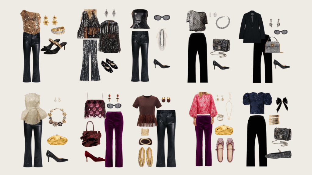 The Problem: Party Season Wardrobe Fatigue Here’s the secret no one tells you about party season dressing: you don’t need more tops. You need to get smarter about your bottoms. That gorgeous sequined cami or embellished blouse sitting in your closet? It’s not just one outfit – it’s five completely different looks depending on whether you pair it with denim, a black leather pants outfit, velvet pants, or even a bold purple pants or sequin pants outfit. The magic happens when you start thinking of your going out tops as the constant and your bottoms as the variables. Master the leather pants outfit formula, understand how velvet pants outfit styling changes the entire energy, and suddenly your wardrobe works exponentially harder for you. Your favorite going-out top isn’t one outfit. It’s a foundation. And depending on what you pair it with, you can be casual-cool, edgy-sophisticated, ladylike-elegant, or fashion-forward-bold. Same top, completely different energy. Nice top + black leather pants A black leather pants outfit instantly makes the same top look cooler and more intentional, perfect for a night out outfit or a dressier party. Nice top + velvet pants Velvet is the elegant upgrade, and a velvet pants outfit gives you rich, festive energy with minimal effort. If you want to stand out without going costume, try a purple pants outfit, especially in velvet pants, because the color reads bold but the texture keeps it elevated. Nice top + sequin pants If you want the fully festive option, go for a sequin pants outfit. This is the easiest way to commit to celebration for New Year’s or any big event. If you’re dipping your toe into party pants for the first time, you might be more comfortable if you keep the silhouette simple and let the sparkle do the work. Your styling rule is simple: pick one hero piece, either the sequin top or the sequin pants, and keep everything else sleek so you look styled, not chaotic. Styling what you own Shop your closet like a stylist. Pull three tops you love, then try them with jeans, leather or faux leather, velvet, purple, and sequins, and take quick mirror pics. Try not to think too much about what you see in the mirror – sometimes ‘self-talk’ can be negative. Rely on the side-by-side images for making observations instead of making observations in the mirror. You can be kinder to yourself in the pictures of side-by-sides instead, because you can be more objective in a side-by-side. If you are not sure what wins on you, post the side-by-sides in Adjust My Crown and let the votes settle it, then save the winner in a Collection like “Christmas party outfits” or “NYE outfits.” That way you can pack your Christmas trip outfits quickly, and next year you can rewear it, tweak one piece, or reshop a better version using the outfit you already know worked. $78 This tee is a party on her own. Take me there $98 This cape is a whole personality. Take me there $49 Amazon for the win. Take me there $78 Perfectly ladylike and perfectly rebellious at the same time. Take me there $169 The waist, the seams, the darts on this jacket are sculptural perfection. So chic! Take me there $158 This is a forever piece and for all 4 seasons Take me there $41.98 So good for the price! Take me there $240 So much styling potential Take me there $138 Fringe is so in right now and i’m here for it. Take me there $128 The jacquard plus the sleeves – another party of a blouse. Take me there $252 The pattern! The sleeves! Take me there $168 These black velvet pants make the outfit more polished, ladylike or dressier Take me there $238 Makes the look edgier than black denim. Perfect for super feminine tops… or edgy to up the edge… whatever you’re trying to “say”! Take me there $70 Great leather look option Take me there $199 Makes the look more bold and feminine at the same time. Take me there $50 ugh – so good Take me there $120 Sequins, on velvet… kind of genius Take me there $60 Sequins, with 5% spandex in the composition Take me there Shop Your Closet First Before you buy anything new, I challenge you to try this experiment: Pull out your three favorite going-out tops and style each one with every different bottom you own. Jeans, leather, velvet, trousers, skirts – everything. Take photos of each combination. The STAR method is great for this. I guarantee you’ll discover outfits you never knew you had. That top you thought “needed” specific pants to work? It probably looks amazing with three other things you already own. That velvet you only wear one way? It’s probably more versatile than you realized. Shopping your own closet is the most sustainable, budget-friendly way to expand your wardrobe. And once you understand which bottom types work hardest for your lifestyle and personal style, then you can make intentional purchases that genuinely fill gaps rather than just adding to the pile. Shopping your Closet side note: If you own velvet pants and/or waxed jeans or leather pants that you don’t even have the will to try on with your fun top, why not? Why are you keeping them? Should you maybe be looking to pass those on to someone who would wear them and find options you’d wear now? Something to think about… Maybe start a “Do I need a new version?” Collection in Adjust My Crown for when you’re shopping to see if it’s something you really were looking for anyway. Styled Outfits