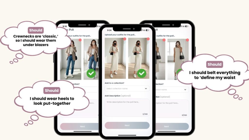 Stop obeying hand-me-down Style rules and let your real life become your personal style inspiration How many outfit “shoulds” run through your brain before you even get your coffee? You should wear a blazer to look serious. You should belt everything. You should copy that influencer. No wonder getting dressed feels loud and crowded. Here’s the quiet version: your closet is a tiny lab, and you get to write the data-backed rules. Instead of scrolling for your personal style inspiration, you’ll start noticing what you actually wear, photograph a few outfits, and let side-by-side photos in Adjust My Crown tell you what’s really working. Spot the “Shoulds” in Your Closet For the next two weeks, don’t buy anything. Instead, every day snap a quick mirror photo of what you wore and log it in Adjust My Crown. As patterns show up—same jeans, same jacket, same shoes—you’ll see your real life, not somebody else’s grid. That’s the baseline for your dream of “finding my style” (It’s easier and quicker than you could have dreamed). Run Your Own Style Experiments Now you answer “how to dress better” by running tiny experiments. Take one outfit formula—like blazer + tee + jeans—and photograph two versions: crew vs V-neck, loafers vs sneakers, belted vs relaxed. Post side-by-side photos as polls in Adjust My Crown so your future self and the AMC community can vote, gently. Turn Results into Your Own Style Rules After each poll, write one clear sentence that turns an old “should” into your rule. “Black is slimming” might become “Color blocking wins on me.” “Heels look polished” might become “Loafers are my everyday polish.” Capture these as your personal style rules in the app comments under each poll. This is how to find your style without overthinking: evidence first, opinion second. Wear the Winners on Repeat Once you’ve got a few rules, build outfits around them on purpose. If sneakers win every poll with your midi dresses, make that your weekday uniform. If unbelted columns keep reading cleaner, stop fighting it. Your clothes start working for you, not the other way around. If you’ve been quietly googling How to have style or How to look put together, this is your sign to stop collecting opinions and start collecting data. Give yourself two weeks of closet experiments inside Adjust My Crown. Keep the pieces that win, donate the ones that don’t, and enjoy mornings that finally feel calm. The Should: Crewnecks “Crewnecks are ‘classic,’ so I should wear them under blazers.” The Test. Same blazer, same jeans, crew vs V-neck. Snap both, post them in Adjust My Crown, and run a poll. Your Rule. If V-neck wins repeatedly, write it down: “Blazer + V reads cleaner on me.” Keep the best V, retire the meh crews. Less guessing, more repeats of what actually works. The Should: heels “I should wear heels to look put-together.” The Test. One midi dress, two shots: loafers vs minimal sneakers. Post: “Loafers or sneakers for everyday?” Your Rule. If sneakers win big and you love them, own it. “Polish = clean sneaker + crisp layers.” Build weekday outfits around that combo and shop your closet for pairs that already nail it. The Should: Waist Definition “I should belt everything to ‘define my waist.’” The Test. Same shirt dress, two photos: unbelted column vs belted. Poll it, then really look at the pictures. Your Rule. If column wins, note it: “Long line over cinch on busy days.” Move belts out of prime real estate. If belted wins, start tailoring and buying belts that sit exactly where you like. Either way, your rule > their rule. How have your “shoulds” actually helped you? In the end, it’s simple. The side-by-sides in Adjust My Crown do the talking. Put two photos next to each other—neckline vs neckline, hem vs hem, rise vs rise—and your own body will tell you the rule, no guilt required. Keep what wins on repeat, let the rest go, and enjoy the calm that follows. Download Adjust My Crown and post your first side-by-side tonight. Blur your face if you want; this isn’t social media. Look real on AMC so you can walk into real life looking and feeling your best. FAQ Do I really get to ignore traditional fashion rules? Yes. Most “rules” were written for someone else’s body, budget, and life. With Adjust My Crown, you create your own evidence-based Style rules by comparing photos, running polls, and keeping what clearly works on you. How does this help me figure out How to dress better without buying more clothes? You start with what’s already in your closet. By logging daily outfits and testing small tweaks—neckline, shoe, proportion—you see which pieces actually earn repeat wear. That proof tells you what to keep, what to let go, and what’s missing. What if I feel awkward taking outfit photos? Totally normal. Keep the shots simple, blur your face if you want, and remember Adjust My Crown is not social media. These photos are tools, not performance. The goal is data that helps you feel more confident getting dressed. How often should I run polls in Adjust My Crown? Start with a two-week experiment. Aim for a few polls each week—neckline vs neckline, shoes vs shoes, belted vs unbelted. That’s usually enough data to write a handful of strong personal rules you can rely on. Can this method help with How to have style long-term? Yes. Style gets easier when you stop guessing. As you collect more polls and notes, you’ll see patterns: shapes, colors, and combos that always win. That becomes your long-term style playbook, not a fleeting trend list.