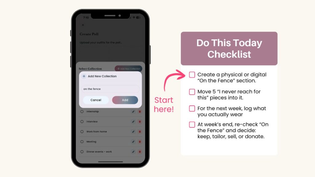 Problem: An overflowing closet gives you choice overload and blocks outfit inspiration. Fix: Use a slow filter; each season move unworn pieces into an “On the Fence” mini zone. Clarity: As you Declutter closet, you see what you actually wear and love. Result: A more organized closet that quietly teaches you what to keep, tailor, sell, or donate. How a Slow “On the Fence” Filter Helps You Declutter closet Without Regret Why a full closet still feels like “nothing to wear”When your closet is packed, your brain hits choice overload. You see colors, patterns, and maybe even tags… but you don’t see a story. There’s no record of what worked, no feedback on what flopped, and no gentle way to declutter closet pieces you’ve outgrown. The first step is simple: create a tiny “On the Fence” section and move 5 maybes there today. AMC (Adjust My Crown) turns that micro habit into a system that slowly reveals what actually earns a spot in your organized closet. The three invisible problems: options, no record, no feedback Your brain wasn’t built for 200+ daily clothing choices. Without closet organization, you scroll your hangers the way you doom-scroll your phone. –Too many options: Every piece shouts at once, so you default to the same safe outfit.–No record: You forget which looks made you feel confident or matched your style goals–No feedback: Items that never leave the hanger blend in, instead of quietly getting voted out or worn regularly AMC logs what you wear, and leaves room for comments underneath (how you felt, the temperature, or juicy info like who you were on the date with) so the data—not the drama—guides what stays and when you wear it. The slow filter: how “On the Fence” works “On the Fence” is your new holding pen for those pieces that crowd your closet. These are things you see in your closet and your brain says ding, ding, ding, haven’t worn, so you grab it. But you don’t want to wear it or style it. Put it in a separate place in your closet. Try to make yourself style those pieces. Start a Collection in Adjust my Crown called “On the Fence” and add polls of those things, styled. You’ll know pretty quickly if they’re worth keeping or if it’s time to let that piece go on to a better home. You’re not forcing a massive purge in one weekend. You’re running a quiet, ongoing filter: wear it, log it, learn from it… or move it aside. How this turns into real style (not just a tidy closet) As the noise leaves, patterns show up. You see which silhouettes and colors you repeat and which never leave “On the Fence.” That’s real data for finding your style and personal style inspiration, not a mood board of inspo (which is also helpful in its own way…). The result: it gets easier to feel pulled toward clothes that make YOU look intentional, and look like you. Day by day, the closet and the daily outfit pics nudge you toward how to look put together and how to dress better, instead of fighting you every morning and taking up decision making brain power. That’s how AMC supports your personal style—with tiny, trackable decisions, not pressure to become a different person overnight and to consume, consume. Do-this-today checklist Create a physical or digital “On the Fence” section. Move 5 “I never reach for this” pieces into it. For the next week, log what you actually wear. At week’s end, re-check “On the Fence” and decide: keep, tailor, sell, or donate. That’s how AMC quietly upgrades your storage and organization, mood, and calendar—all through smarter closet organization and more confident daily outfits. Why does a full closet still kill my outfit inspiration? When everything is visible at once, your brain hits choice overload. Without a record of past wins and fails, every morning feels like starting from zero, so you default to the same safe outfits and feel like you have “nothing to wear.” How does the “On the Fence” method help me Declutter closet without regret? Instead of forcing a huge purge, you move unworn pieces into a separate zone for a season. Time and tracking do the work; if an item stays there, it’s easier to donate, sell, or tailor because you’ve seen you don’t actually reach for it. How does AMC support better Closet organization over time? AMC logs what you wear, highlights pieces you rarely use, and surfaces patterns in color, fit, and vibe. That information guides what gets prime space, what moves to “On the Fence,” and what leaves, which naturally leads to a more organized closet. Can this approach help me build a capsule wardrobe? Yes. As AMC tracks outfits and cost-per-wear, you’ll see which items mix and match easily. Those become the core of a future capsule, while single-use pieces usually migrate to “On the Fence” and eventually out of your space. How does this connect to Finding my style and how to dress better? By logging real outfits, you see what you feel great in instead of guessing from trends. Over time, AMC reveals patterns that guide your shopping and edits, so “how to look put together” becomes a repeatable formula, not a one-time lucky outfit.