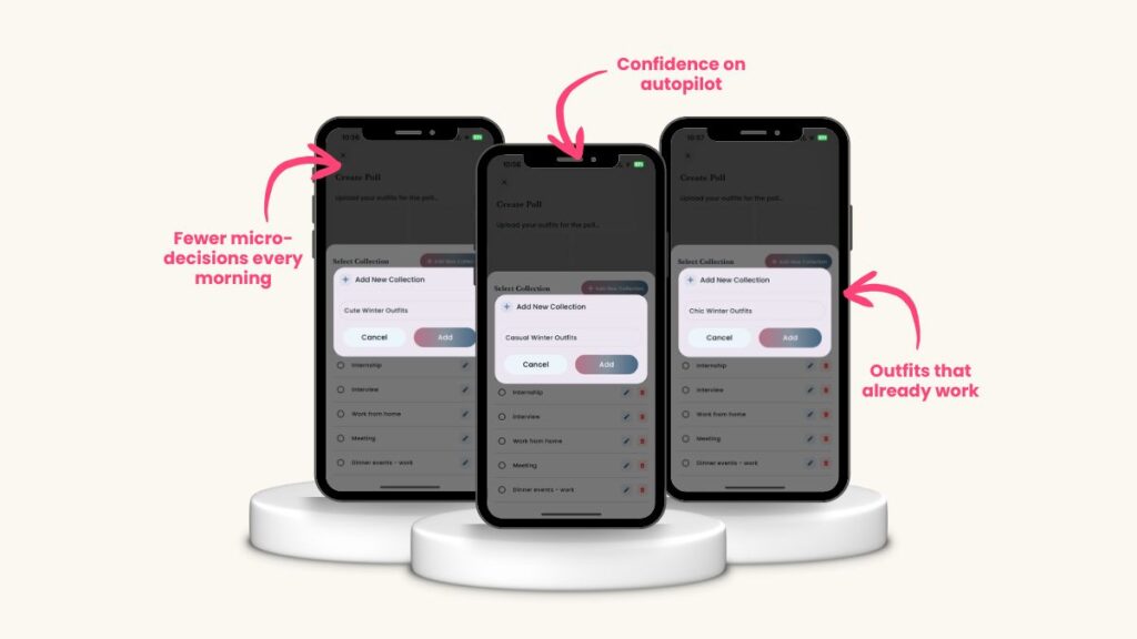 AMC TL;DR Using Adjust My Crown helps you turn this guide into 18 real, repeatable cute cold spring outfits, from things you already own—so you’re not staring at your closet in a towel tomorrow morning. Use polls to pre-decide your next outfits once, then save them in Collections so weekday getting-ready takes 30 seconds instead of 30 minutes. You’ll be your own stylist, spend less by rewearing what you own, and walk out the door in outfits that are already tested, loved, and ready to go. How to Turn “Nothing to Wear” Into 18 Default Cute Spring Outfits You know that moment: towel on, hair half-dry, floor covered in clothes, and somehow there are still “no cute cold outfits” that feel right. The problem isn’t you or your style or lack of outfit inspiration or lack of the right clothes; it’s that your brain is trying to do math it was never meant to do, mixing dozens of tops, bottoms, shoes, and layers in five minutes flat.In Adjust My Crown, start a Collection called “Spring Defaults” or “Cute Spring Outfits” (or be way more creative than I am with these straightforward Collection titles) and upload 5–8 outfits using pieces you already love so that crowns can vote and you instantly see which combos are worth repeating this week. Within 24–48 hours, you’ll have 3–5 go-to looks locked in, and your future self will never have to re-solve the “nothing to wear” puzzle before work again. Why “nothing to wear” happens (it’s not you, it’s outfit math) Most closets are full of single pieces, not ready-made outfits, so every morning becomes a fresh equation with hundreds of possible combos. Your energy is low, the clock is ticking, and suddenly everything feels wrong, even the cute winter outfits you liked last week and now trees and flowers are blooming… but it’s still cold! Think of outfit formulas like recipes (fully styled outfits): jeans + white shirt + trench + loafers is one solved equation, not four random items. Adjust My Crown acts like a stylist in your phone, remembering which “recipes” actually worked and serving those outfits back when you’re getting dressed, so you are not starting from zero every cold morning. The 5 outfit formulas that always work When in doubt, stop scrolling and reach for a formula; these five base combos can become endless cute winter outfits with tiny tweaks. Use them as your non-negotiable defaults when you’re tired, late, or not in the mood to experiment.–Straight-leg jeans + white button-down + trench + loafers–Black trousers + fitted tee + blazer + sneakers–Mini or midi skirt + chunky sweater + tights + ankle boots–Fitted tee + cardigan + jeans + sneakers–Sweater dress + trench or long coat + boots + belt Your own Lookbook If you screenshot even one of these outfit ideas, you need Adjust My Crown to actually turn them into repeatable looks (in your Lookbook) using the clothes you already own and wear (organized into Collections). 18 cute winter outfits using repeats Here’s where formulas become real life: you don’t need a new wardrobe, just intentional repeats of your best pieces. These 18 cute winter outfits use the same tops, bottoms, shoes, and third pieces you already love so you can shop your closet before you shop online, no matter how tempting the sales are now. Swap in the pieces from your own closet:–White button-down + black trousers + sneakers–White button-down + straight-leg jeans + loafers–blazer + fitted tee + jeans + ankle boots–Chunky sweater + skirt + tights + ankle boots–Chunky sweater + black trousers + loafers–Cardigan + tee + jeans + sneakers–Trench + fitted tee + straight-leg jeans + sneakers–Blazer + chunky sweater + trousers + loafers–Cardigan + sweater dress + boots–White button-down + trench + trousers + loafers–Chunky sweater + white tee peeking out + jeans + sneakers–Fitted tee + black trousers + blazer + ankle boots–Sweater dress + trench + boots–Sweater dress + loafers–Sweater dress + sneakers + trench–Sweater dress + sneakers + blazer–Chunky sweater + skirt + loafers–White button-down + jeans + ankle boots Use Adjust My Crown to find your best outfits from pieces you already own before buying anything new, then save the combos that get the most love so they become your true “cute winter outfit defaults.” Crowns and polls turn “maybe cute” outfits into tested, voted-on winners you can confidently repeat all winter. Ending the poll immediately saves the outfit to a Collection immediately when you don’t care about polls. Clothes and habits? If you’re new to using AMC, making it a habit to just capture every outfit this week will give you your own winter outfit formulas. How to make each formula casual vs chic The fastest way to double your cute winter outfits is to style the same base two ways: casual and chic. Instead of chasing totally new looks, just swap a few details and let structure, shoes, and styling do the work. Casual Winter Outfits sneakers instead of loafers, cardigan instead of blazer, untucked shirt, minimal jewelry, beanie Chic Winter Outfits loafers or ankle boots, blazer or trench instead of cardigan, a defined waist with a belt, neat tuck, statement earring or watch App 101 In Adjust My Crown, create a mini poll where each slide is the same base formula styled casual vs chic so we can vote which version should be your go-to for work, coffee dates, or nights out, based on where you say you’re going. Or create two different collections, maybe “Casual Winter Outfits” and then the dressier version “Chic Winter Outfits” (please be more creative than me). Try This in Adjust My Crown–Pick 5 base formulas from this post (jeans + white shirt + trench, trousers + tee + blazer, etc.).–Create a new poll titled “Cute Winter Outfit Formulas.”–Snap or upload 1–2 real-life outfits for each formula.–Let crowns vote on the cutest combos–Organize the looks into a Collection called “W