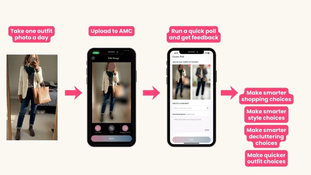 Quick Answer + Save This Quick answer: Take one outfit photo every day—same spot, same pose, same crop. It’s not for Instagram; it’s evidence. In a week you’ll see what you actually wear (hello, black turtleneck…again) and exactly which colors you own, so quick and easy outfits become obvious and duplicate buys disappear. Add a simple caption: weather, occasion, comfort. Do this: Make the cue obvious. Shoes on? Snap it. Keys in hand? Snap it. Put a sticky note on your mirror for three days and set an 8:30 AM reminder. Then: Run the two-minute flow: stand in decent light, open camera with full outfit in frame, blur background, save, blur face if you want. Next: Caption with three words—weather, occasion, comfort. Example: “37°F sunny, errands, super comfy.” Solve the what to wear question with two pictures a day Have you ever been in a dressing room holding a sweater and wondered, "Do I already own this color?" Same. My daughter said it during the post‑Christmas sales and it was painfully relatable and a lightbulb went off, especially as we were on the cusp of a New Year and the resolutions or Atomic Habits we want to tweak from the year before. The fix is small and powerful, and easy (and free, unlike that sweater, even at 50% off). Take one photo of your outfit every day. It’s that simple. Not earth shattering at all. It’s not for Instagram. Not for a grid. Just evidence. This Atomic Habits approach builds quick and easy outfits because it shows what you reach for to wear daily and exactly what you own. Technically what she said was, "I wish I knew all the colors of sweaters I wear." I feel like I need to clarify that in case she reads this. Why daily photos create quick and easy outfits Scroll a week of outfit images and the truth pops. That black turtleneck shows up three times. The sequin sweater? Missing in action. Shopping gets sharp because you see that you own four gray sweaters and their necklines. No more duplicate buys. No more “great deals” that get worn once, cause guilt for 2 years, and get decluttered in year 3. The wear pattern matters more. If your Isabel Marant or Free People fleece stars daily, buy another fleece for variety. Skip the fantasy sequin. This is cost‑per‑wear math in plain sight. Less but better. And yes, she bought the sweater. Also, we resolved to take a picture a day this year. No crazy ‘no shopping year’ or ‘year of gratitude.’ Just a picture of every outfit. What to Wear Women: build the Atomic Habits photo stack Make the cue obvious. Shoes on? Snap it. Keys in hand? Snap it. Phone check before leaving? Photo first. Same spot, same pose, same crop. Put a sticky note on your mirror for three days. Set an 8:30 AM reminder as backup. Night photo still counts. You’re building a streak, not a museum or a picture perfect feed. My pics are hideous and that’s fine. I blur the background and my face. This isn’t social media. This is to go out and live my life, feeling my best. Two‑minute flow–Stand in one spot with decent light.–Open camera, full outfit in frame.–Blur background. Save. Blur face.–Caption with three words: weather, occasion, comfort. Example: "37°F but sunny, errands, super comfy."Done in under two minutes. Quick and easy outfits because of Comments Don’t skip the Comments under each set of pics. My 7am brain forgets details, and so does my packing brain. Use the comments to document the real conditions, not vague seasons. 42° and windy needs different choices than sunny 42°. Use temperature, wind or rain, and your day type. Next time you need quick and easy outfits for 35° school drop‑off, your winners appear immediately. Next time you pack for 78 and rainy, when it’s 42 and windy, you won’t be confused, like I was before I figured this out. What to Wear: review patterns on Day 7 and Day 14 Open your grid after one week, then two. Circle repeats. Spot color clusters. Identify hero items. –Clothes you actually wear. Charcoal fleece appears three times. That’s a green light to buy a second shade or a fun patterned fleece, not an out‑of‑character trendy piece.–Workhorse layers. The white tee that layers well twice gets priority over a novelty top.–Color clues. Six navy tops in nine days? Add navy‑friendly accents instead of chasing a random palette. Those shoes you fell in love with? If they go with the navy tops you’re clearly so fond of, you can justify them now!–Post a 2‑photo poll in Adjust My Crown when you’re torn, for both preshopping decisions and what to wear decisions. Polls are automatically saved. Atomic Habits for smart wardrobe purchases Rules before anything new comes home.–Five‑outfit test. Can it make five outfits with what you own today? You can quickly look through your saved polls on AMC to spot 5 things that would go with that item, if you’re already doing daily polls.–Do‑not‑buy‑again list. Itchy knits, droopy necklines, tight sleeves. Once burned, never again. Leave notes in the AMC Comments about what’s annoying and move those polls to a “DO NOT BUY” Collection you create.–Three‑month cost‑per‑wear. If a $98 fleece gets 15 winter wears, that’s about $6.50 per wear. If a $250 coat hits 20 wears this year, that’s $12.50, which is likely better CPW than a novelty jacket you’ll wear twice.–A “maybe” is a no. Tiny experiments to run this week to level up your style Try these side‑by‑side tests and let AMC settle it in your mind.–Neckline test. Same outfit, v‑neck vs crewneck. Which frames your face better?–Shoe swap. Ballet flats vs tennis shoes with the same jeans and sweater. Which will you walk in all day?–Layer check. Long coat with slim knit vs cropped puffer with chunky knit. Which balances your proportions?–Color repeat. Best color on top vs bottom. Which wakes up your face? Post these