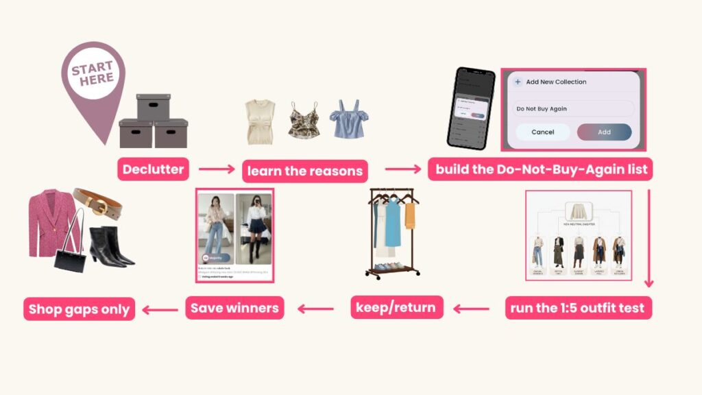 Quick Answer + Do Today Declutter pile = data: Fit, lifestyle mismatch, or duplicates → turn each into a shopping rule. Do-Not-Buy-Again list: If you declutter it more than once, stop re-buying it. The 1:5 Rule: One new item must make five real outfits with what you already own. Shop gaps only: Buy what completes outfits—not random “cute.” How to Shop for Clothes Without Adding Closet Clutter Let’s be honest: you can do a closet cleanout, feel amazing, and still end up right back where you started. Not because you “failed.” Not because you’re messy. Not because you need to Marie Kondo harder. It’s because decluttering is maintenance… and shopping is the source of the future clutter. If you want to stop the clutter from coming back, you don’t need another cleanout. You need closet entry rules—a way to decide what gets to come home with you in the first place. This post is my favorite way to do that: a simple system for how to shop for clothes without turning your closet into a revolving door for shopping/clutter. Why closets get cluttered again (even after decluttering) Here’s what usually happens: You declutter. You donate. You make piles. You swear you’re “only buying basics” from now on. You feel like a brand-new person. Then you go into Target (or scroll your favorite site) and suddenly you’re holding a “cute little top” that seems harmless because it’s only $24 and it’s “so versatile.” Or maybe you big splurge on a top your favorite Influencer had on and looked so chic in and it's dry clean only and you'd never actually wear it in your real life. Fast-forward: it gets worn once (maybe), then it becomes one of those pieces you’re always moving around but never choosing. So the clutter returns. And it builds. And the problem isn’t that you didn’t declutter hard enough. The problem is that your closet has no “entry policy”. Think of it like this: decluttering is taking out the trash. But your shopping habits are the open front door. If the door stays open, stuff will keep walking in. Step 1: Use your declutter pile as data Your declutter pile isn’t “stuff you don’t want.” It’s your closet giving you receipts. Most things get purged for three reasons—turn each into a rule: –Fit problems: pinches, rides up, needs “the right bra,” you tug all day.Rule: “I don’t buy this unless it fits perfectly right now.” No tailoring dreams. No “it’ll stretch.” –Lifestyle mismatch: cute in theory, wrong for real life (hello, dry clean only / heels / fussy pieces).Rule: “I don’t buy items for my fantasy life.” –Duplicates: “another version” you never wear because you already have a favorite.Rule: “I don’t buy duplicates unless it replaces something worn out.” That’s how decluttering clothes becomes data, not guilt. Step 2: Build a “Do-Not-Buy-Again” list This is your shopping guardrail against things you keep buying… and keep decluttering. Examples: scratchy sweaters, fussy shoes, trendy tops you avoid, “almost perfect” jeans, dry-clean-only anything, fantasy-life purchases. If you declutter a category more than once, it goes on the list. No debate. Stop re-buying what your closet has already rejected. You have to be brutally honest about (and grateful for) your lifestyle if you want to truly wear the clothes in your closet. Step 3: The 1:5 Rule (One New, Five Old) This is the rule that prevents clutter before it happens. Before you keep anything new, you have to style it five ways using what you already own. One new piece must create five real outfits. Not five fantasy fits. Not five “it could work if I had…” situations. Five outfits you would actually wear in your real life. If you can’t make it work with your current closet, what you’re buying isn’t an outfit-maker. It’s a future item to declutter. How to practically do this, because styling clothes isn’t easy! The STAR method is your easy way of doing this: Scan the new piece against your entire closet. Take out everything that could work. Arrange into outfits. Remember with pictures (Your 7am brain shouldn’t have to work so hard on things that are easily remembered.) Step 4: Turn this into a 10-minute preshopping routine (AMC version) Here’s the part that makes this system stick.Because the hardest part isn’t understanding the rule. The hardest part is remembering it when you’re tired, rushed, and standing in fitting-room lighting that has never done anyone a favor.So you make the rules visible and easy.This is where Adjust My Crown becomes your shopping safety system. Your 2-minute preshopping routine: –Create a Collection called “Do Not Buy Again" and move outfits with those pieces into that Collection.–Create a Collection called “Need More to Match With.” Add outfits where there’s one piece you want to wear more, but you don’t have enough other items to pair it with yet. Step 5: Shop for gaps that you've realized by being more analytic Common “gap fillers” that quietly fix a wardrobe:–a neutral belt (structure is an outfit-maker)–a true third piece (blazer, cardigan, denim jacket)–a shoe lane upgrade (white sneakers + loafers, or ballet flats + tall boots cover so much life)–a structured bag (instant polish) And sometimes the best “gap” isn’t a clothing item at all—it’s a closet tool that makes your wardrobe easier to see outfits in, like Adjust My Crown.Because the goal isn’t “own more.” The goal is wear more of what you already own and feel fantastic in it. The Preshop Filter (the whole system in one line) If you want the whole thing as a simple mental checklist, here it is: Declutter → learn the reasons → build the Do-Not-Buy-Again list → run the 1:5 outfit test → keep/return → save winners → shop gaps only That’s it. That’s the shopping safety system.And it works because it treats your closet like a real ecosystem, not a mood board for a fantasy l