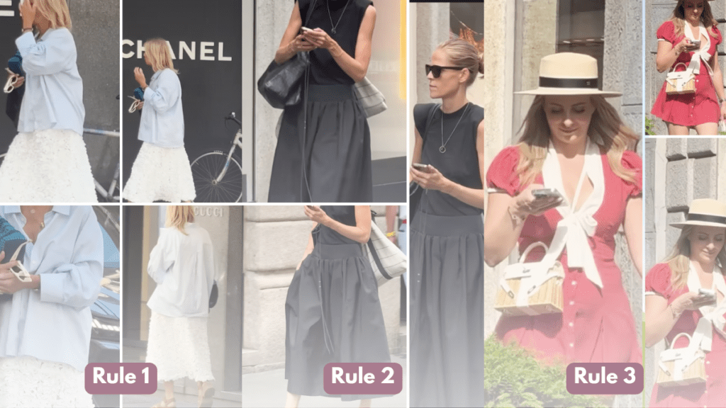 9 examples. 3 rules. 0 guessing Summer outfits are where polish gets tricky. You want ease, you want clean lines, you want outfits to look expensive, instead of a flimsy falling apart cotton, and you also want to breathe. The issue is not your taste. It’s the math. Lighter fabrics, less layering, and one wrong shoe can push a look into I Gave Up energy (not polished Low Effort Energy). So I’m using 9 Milan street style outfits to prove 3 rules (You know I hate rules. Feel free to break these all), then we’ll run quick tests in Adjust My Crown so you stop staring at your mirror, unconvinced, and unsure. Three rules that keep summer outfits looking expensive Rule 1 of 3: One statement piece, everything else simple Let one item be the headline. The rest stays simple. Outfit 1 of 9: Guipure lace skirt + oversized boxy blue shirt. The lace is the main event. The shirt is the quiet balance. Crisp meets delicate, and the contrast reads expensive. Outfit 2 of 9: Bold print layer over a simple base. The print gets the spotlight. The base stays clean so it looks styled, not busy. Outfit 3 of 9: That green and cream Valentino print dress is working. The rest stays streamlined so the print looks like a choice. Shop your closet first. If you don’t own guipure or broderie, any textured white skirt can play the role, eyelet, embroidery, or crochet. Pair it with the crispiest oversized button down you already have. If it’s a maybe, it’s a no. Rule 2 of 3: Strong silhouette wins before details even show up If the outline is sharp, the whole outfit reads polished. Defined shoulders and a real waist carry the look. Outfit 4 of 9: Black on black with defined shoulders and a defined waist. It’s clean, strong, and confident. No fuss, just shape. Outfit 5 of 9: The white suit. Tailoring equals polish, even in heat. This is one of those “Outfits To Look Expensive” that looks considered without being a ‘try hard’ Outfit 6 of 9: Cream dress, tan bag, sneakers. Simple silhouette, tidy proportions. The sneakers work because the dress isn’t floppy or fussy. If you ever buy one “forever” piece, buy the silhouette, not the trend. A shoulder that holds its shape. A waistband that sits where you want it. A dress that doesn’t collapse when you exhale. Rule 3 of 3: Tight color story, tidy finishing A limited palette reads polished or edited. Then the finishing needs to look intentional. Outfit 7 of 9: One strong color moment, styled simply. The restraint is what makes it feel elevated. Outfit 8 of 9: Tonal pink, sporty and clean. Monochrome makes summer outfits look more expensive without trying. Outfit 9 of 9: Pink suit with a red bag. The outfit is cohesive, then one accessory gets to be the point. Quick filter. Pick one color family for the day. Then pick one item allowed to be loud, either the bag or the shoe. Not both. Keep it that simple. Why advice doesn’t stick without a test You can collect tips forever and still feel stuck, because tips don’t answer the only question you have: Which one looks better on me, today, in real life? When you don’t have a way to decide, you default to the safe outfit, buy a backup piece you don’t love, and keep wondering why your closet feels full but unhelpful and getting dressed feels meh. Adjust My Crown turns the moment of doubt into a simple test. Two photos, one change, fast feedback. Then you stop paying the same mental tax every week. That’s how “Outfits To Look Expensive” become repeatable, not accidental. Three Adjust My Crown polls to steal today Change one variable only in your side-by-side outfit selfies: Poll 1: lace skirt look Version A, half tuckVersion B, full tuckSame skirt, same shirt, different waist story. Poll 2: black on black Version A, flat sandalVersion B, clean sneakerSame silhouette, one shoe shift. Poll 3: pop bag look Version A, tonal bagVersion B, contrast bagSame outfit, one accessory decision. Post the two photos in Adjust My Crown, save the crowned winner, and you never have to debate that exact question again. Your summer outfits checklist, less is more If it’s a maybe, it’s a no.If the silhouette is strong, stop adding things.If the statement is loud, make everything else simple.If the palette is tight, keep the finishing tidy. Do this next Download Adjust My Crown and post your first poll today, then join the email list for weekly outfit tests and pin ready templates that don’t require a panic purchase.