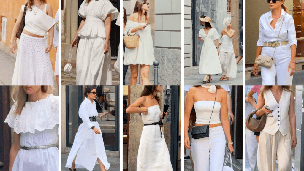 19 White Summer Looks That Show the Rules in Action to Elevate your Outfit (shop your closet for the pieces first) A white shirt is a personal favorite of mine, always, and in every season, so it goes without saying I have an affinity for all white summer outfits. White summer outfits should be easy. Then you put one on and suddenly it feels blah and boring, sugary sweet (which is a total misrepresentation of my personality), or weirdly unfinished like you draped on a sheet and cut out arm holes. The color is beautiful, but the outfit itself is not doing much. That is what these 19 street style images are useful for. They show, very clearly, that “how to elevate your outfit” usually has less to do with buying a new piece and more to do with giving the outfit a little backbone with one of these 6 rules. In these looks, that “backbone” comes from the same handful of moves over and over again: waist definition, texture, contrast, natural materials, and a better finishing choice. This keeps the white outfit from looking or feeling too boring when you wear it. Housekeeping Mom stuff real quick: If you’re worried that the white is see through, just assume it is. The fix is skin tone undergarments or slips, etc, over white ones. White creates a contrast that can be seen but underpinnings that are the color of your skin will blend in. Secondly, if your whites look sad, Oxiclean White Revive is fantastic for keeping whites white without chlorine bleach. It works on yellowing and dingy whites. Rule 1: Define the Waist If there is one move that repeats most often here, it is waist definition. White can drift fast. It can look airy in a good way, or it can look like the outfit forgot to arrive. A defined waist is often the difference between the two. Sometimes that shape comes from an actual belt. One outfit is just a plain white tee and white trousers, but the dark belt and woven bag make the outfit feel finished instead of blank. Another outfit does something similar with a white button down shirt, white trousers, and a gold belt that gives the whole look some polish. A strapless dress with a skinny black belt added shows that one small decision changes the dress from soft and simple to deliberate. In another outfit, the cut of the vest itself narrows the torso and creates shape without needing a separate belt. There are softer versions too. The bottom right outfit has a fitted upper section and a fuller skirt, so the waist reads naturally. Finally there’s a dress with a collar to die for (the layering possibilities!) that uses a silver belt, which keeps all that softness from becoming too floaty. If a white outfit feels vague, these are the first and easiest side-by-sides I would test in Adjust My Crown (apple app store version and google play version): with belt, without belt, tucked, untucked. The answer usually appears pretty fast. Rule 2: Add Texture, Anywhere White needs surface interest. Otherwise it can go flat in a hurry. A lot of these looks work because the outfit is not just white, it is white plus something tactile: eyelet, embroidery, crisp cotton, lace, ruching, woven straw, or raffia. That extra texture gives the outfit depth without forcing it into louder color or more layers. One outfit has a softly textured skirt that saves the whole look from reading too plain. The dress in the bottom right uses a subtle dot print, which is enough to make an easy dress feel intentional. The top middle dress has ruffles and movement, and that texture (and belt) is a big reason it feels feminine without becoming fussy. The top right outfit is just so cool: the oversized white top is simple, but the sheer lace skirt underneath gives the outfit dimension and a very different mood. The same thing happens in the accessories. The bottom left’s woven raffia bag adds warmth and texture at the same time. Even when the clothes are simple, the materials keep the look from feeling one-note. If white feels dull, I would reach for texture before I reached for another piece of clothing. In Adjust My Crown, compare the plain version against the version with the woven bag, the eyelet skirt, the crisp poplin shirt, or the lace layer. Texture often does more than another layer ever will. Rule 3: Use Contrast to Keep White From Looking Too Sweet Some white outfits need edge. Without it, they can tip into bridal, overly delicate, or just too soft for real life. A grounding contrast fixes that quickly. It does not have to be dramatic. It just has to be clear. The top left outfit is a good example. The white-on-white base is simple, but the black Mary Jane changes the whole tone. It gives the outfit some structure and prevents it from floating off into sameness. The bottom left outfit uses that same idea with a black belt on a strapless white dress. The bottom right outfit takes a long white shirt dress and grounds it with a black belt bag and black Alaia flats. The top right outfit uses a black quilted crossbody against a strapless white top and white trousers, and that small dark shape helps the outfit feel city-ready instead of washed out. And yes, contrast can come from a handbag too. It does not always have to be a belt or shoe. The eye just needs one stronger note to hold onto. If an outfit feels too pretty, too airy, or too soft-focus, try one grounded piece: a black flat, a darker bag, a narrow belt, dark sunglasses. Then stop. That is usually enough. Rule 4: Natural Materials Make White Look Warmer and Richer White can look fresh, but it can also look stark if there is nothing warming it up. That is where straw, raffia,