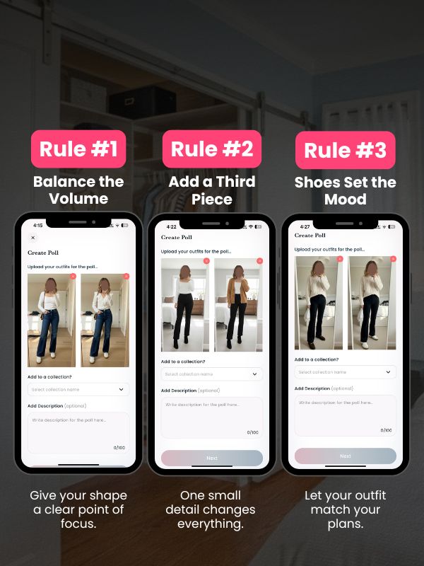 A: Generic advice like “balance volume” means nothing until you see it on your body with your clothes. Polls give you vote-backed proof that a specific combo works, so you confidently repeat it instead of second-guessing every morning.