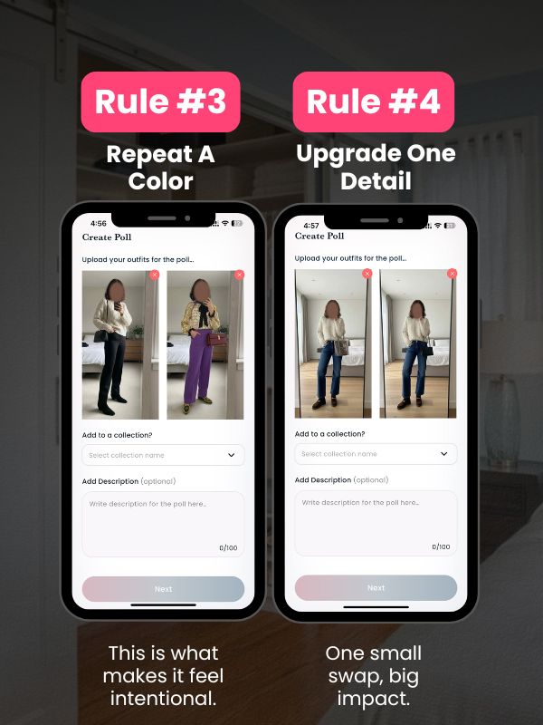 • Use 6 simple style rules (balance volume, add a third piece, match shoes to intention, repeat a color, upgrade one detail, stop at 3 extras) to cut decision fatigue and build repeatable outfits. In Adjust My Crown, poll side-by-sides of each rule using your real clothes, let crowns vote on what flatters you, and save winners to a “Style Rules Default Fits” Collection. The app acts like a stylist in your phone—shop your closet first, spend less on impulse buys, and look more put-together by repeating poll-proven outfits instead of guessing every morning.