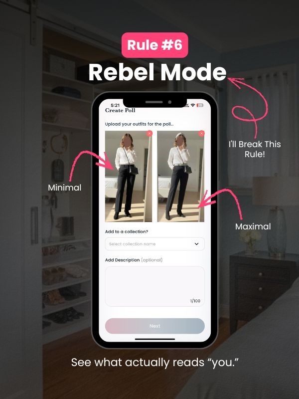 These are flexible not fussy. They're guidelines you can break on purpose later. For now, use them like bumpers at the bowling alley so more of your outfits hit "actually put together." Test these in Adjust My Crown with your outfits because side-by-side or before/after snaps turn rules into personal wins you repeat confidently and ignore rules that never win polls or never make you feel like the 10/10 you are.