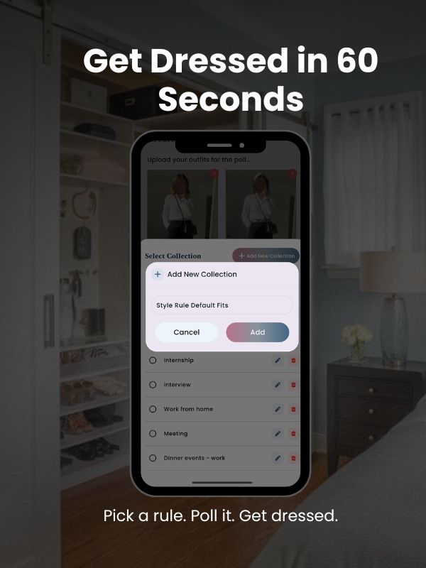 A: You upload outfit photos showing different rule variations (loose vs fitted, with vs without third piece, etc.), run quick polls so crowns vote on which looks better, then save the winners into Collections. This turns your camera roll into a system of tested, repeatable outfits—be your own stylist without guessing.