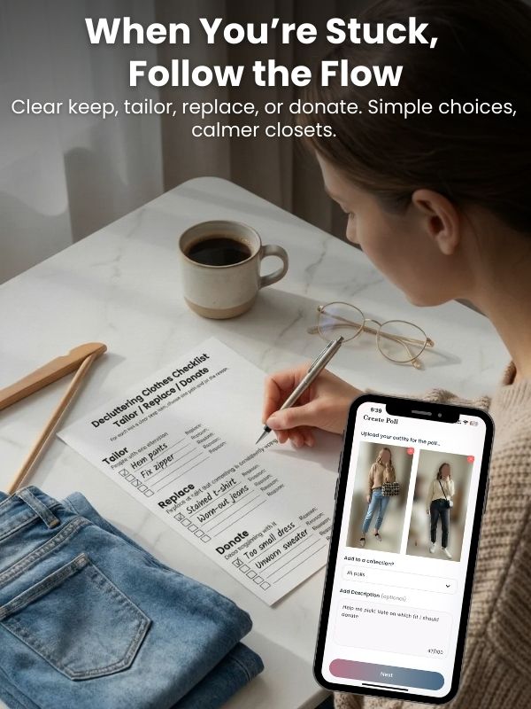 Snap a quick mirror photo and post a two-photo poll with Comments like “Keep/Tailor” or “Donate/Replace”