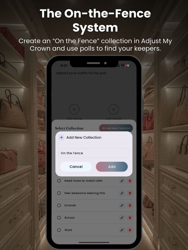 Create an “On the Fence” Collection in Adjust My Crown and set a wear-by date in the title (30 days, by Easter, before spring break).