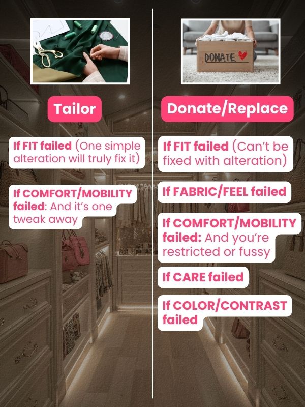 If COMFORT/MOBILITY failed: If you’re restricted or fussy, it’s Donate; if it’s one tweak away, it’s Tailor.