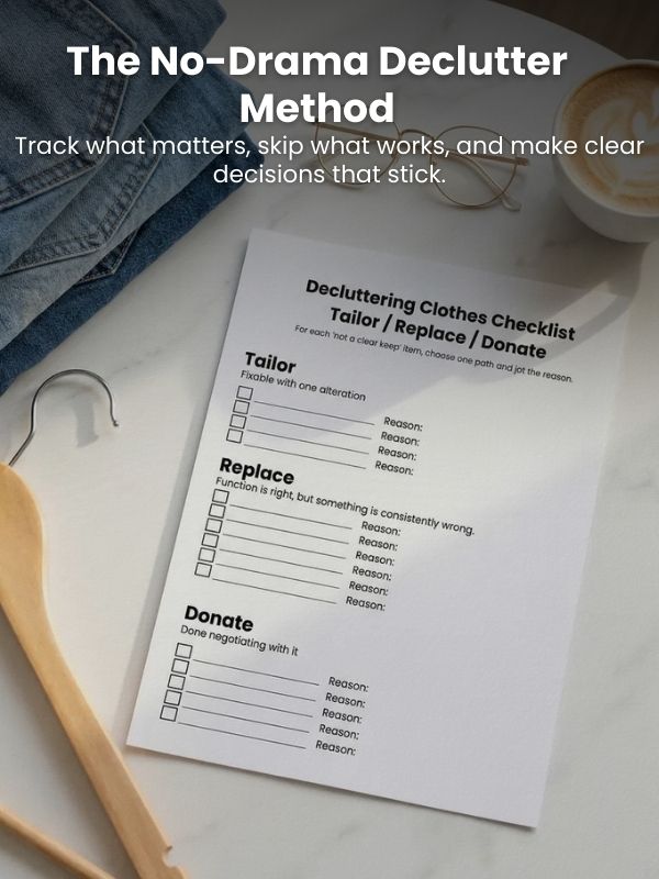 This post is Part 2 of your decluttering clothes checklist system. Monday was the “why it left” side: you tracked reasons and built shopping entry rules. Today is the “what stays, what gets help, and what goes” side – a fast decision grid so you’re not standing in your closet arguing with hangers.