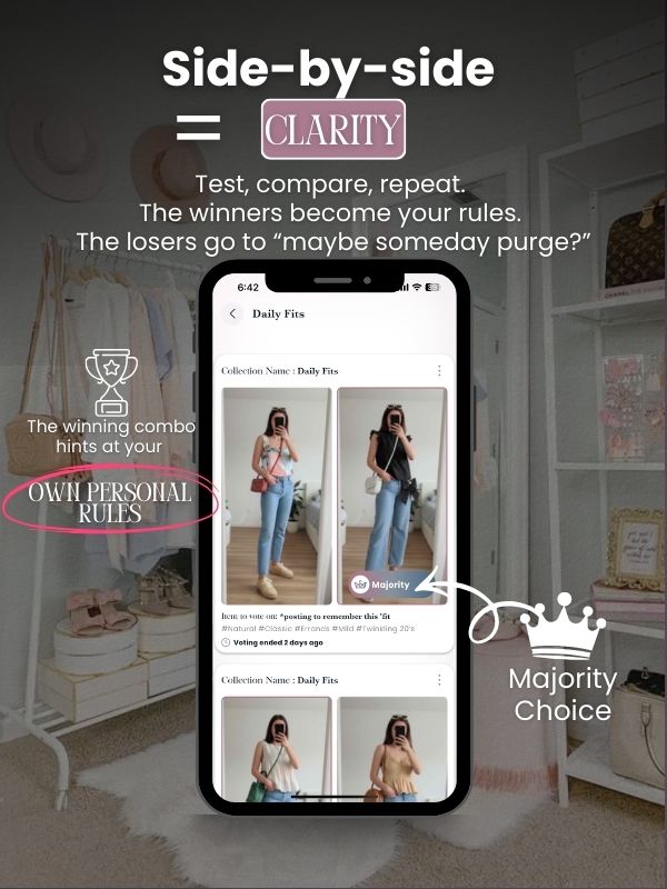 Take 30 seconds to analyze the side by side images and you can usually spot the better option. The winning combo hints at your own personal rules. Keep testing micro-swaps until three to five rules emerge. If an item loses every poll, it’s not a villain—maybe it’s just not your story. Maybe you bought it because it seemed like the thing to buy or it seemed like everyone had one so you should too…