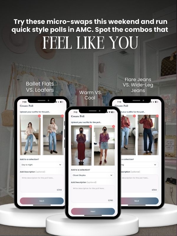 This weekend, shop your closet first. Build two versions of the same outfit—one with a v-neck, one with a crew. Or flats vs tennis shoes. Or socks vs no socks. Or ruffle socks vs crew socks. Post both in AMC and run a style poll.