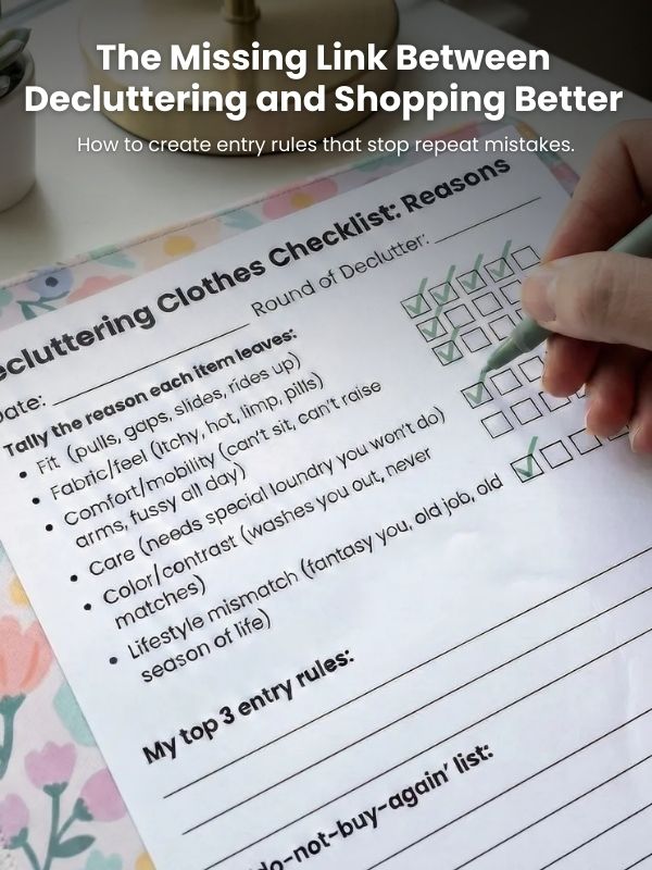 If you’ve ever donated a bag of clothes and then mysteriously re-bought the same problem in a different color, you’re not bad at shopping. You’re missing the bridge between clearing out and letting new things in. I see it all.the.time. A “decluttering clothes checklist” is that bridge, because it doesn’t just ask “keep or toss”. Filled out, it captures the reason each piece didn’t work and you turn that into a rule you can use before anything earns hanger space again.