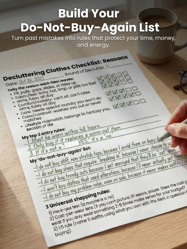 The strongest output of Side 1 isn’t a cleaner closet, though awesome. The strongest output is your rules list. The “do-not-buy-again” list just solidifies your rules. You can skip the section if you don’t think you need to drive the rules home. You’re not punishing yourself; you’re honoring experiments you’ve already run. You’re done lighting money on fire to buy the same headache twice.