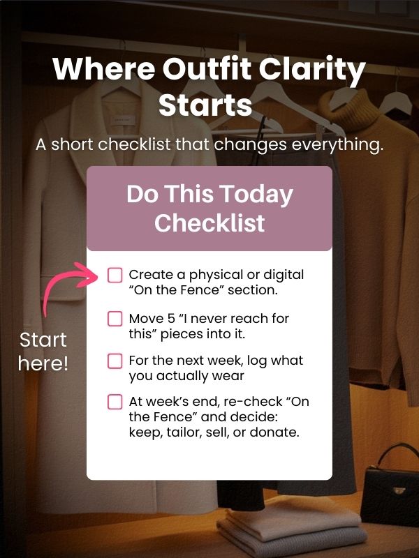 Create a physical or digital “On the Fence” section. Move 5 “I never reach for this” pieces into it. For the next week, log what you actually wear. At week’s end, re-check “On the Fence” and decide: keep, tailor, sell, or donate.