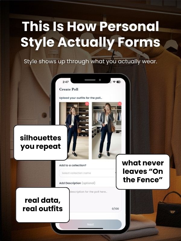As the noise leaves, patterns show up. You see which silhouettes and colors you repeat and which never leave “On the Fence.” That’s real data for finding your style and personal style inspiration, not a mood board of inspo (which is also helpful in its own way…).