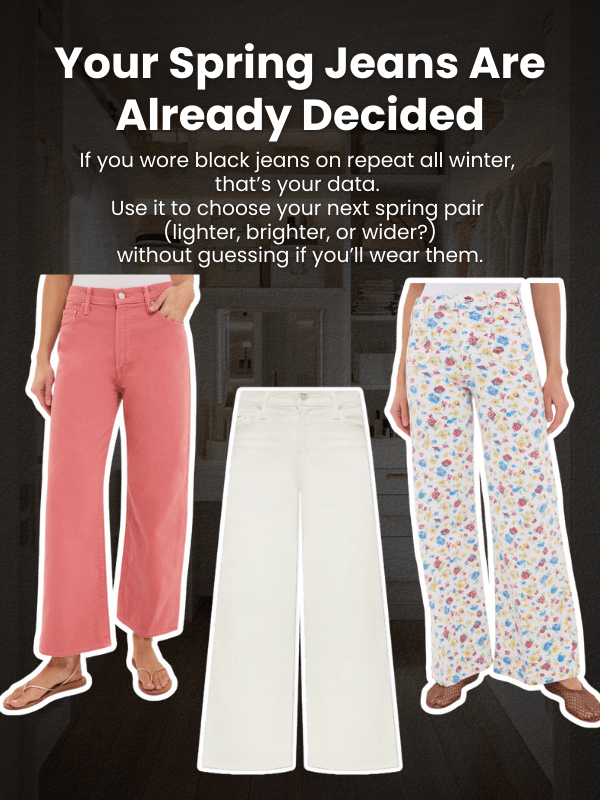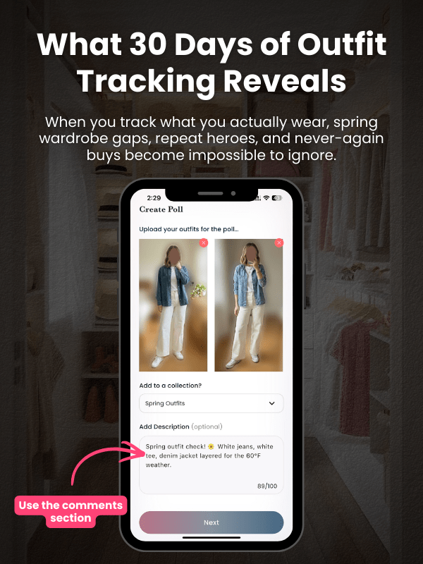 If you believe in the 80/20 Pareto Principle, then it would mean you are wearing about 20% of your wardrobe 80% of the time. If you own 100 pieces, you’re rotating through roughly 20 favorites while the other 80 collect dust. You’ve already self-selected a capsule wardrobe you actually wear. You just haven’t formalized it. The problem isn’t that you don’t know what works. It’s that you keep shopping as if you don’t. Without a record of what you actually reach for when you’re running late or feeling confident, you’re buying blind. Track your daily outfits for 30 days and patterns emerge fast. You’ll see the black jeans appear four times a week. The denim jacket in 60% of spring outfits. The floral midi skirt you’ve never once chosen.