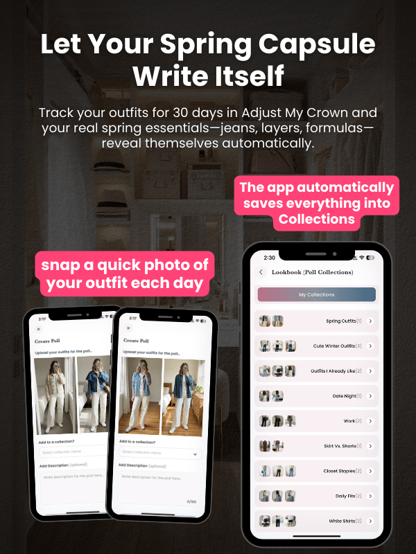 Post a quick outfit photo in Adjust My Crown each day for 30 days. By the end of April, you’ll have a full collection of your real spring daily outfits.