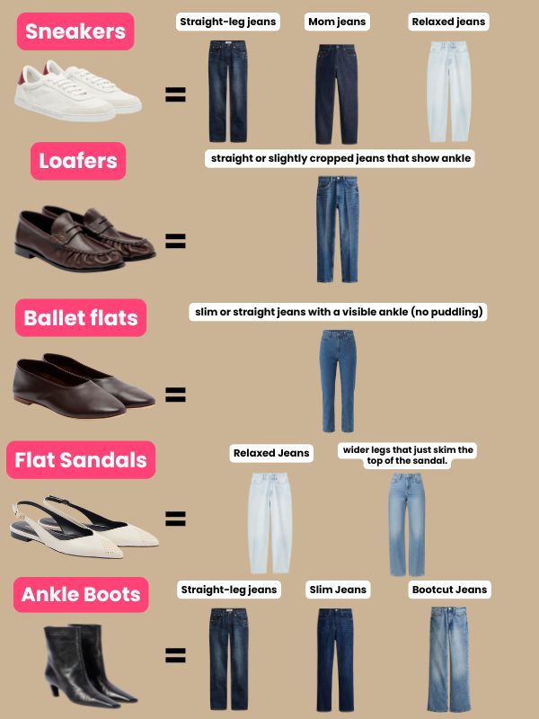 –Slim/straight jeans → statement shoes AND slimmer shoes (sleek loafers, classic sneakers, ballet flats, slim boots).