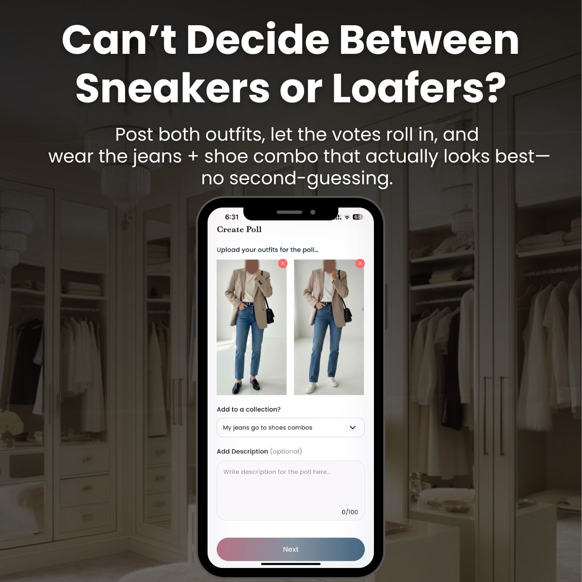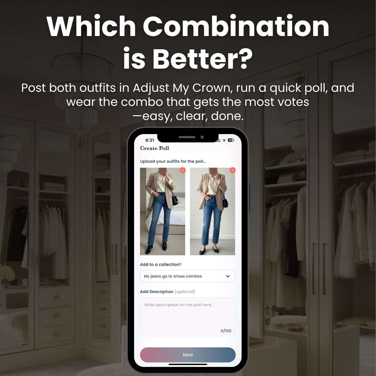Once you’ve tested a few combos and saved the winners, you’re basically building “jeans uniforms” you can lean on. Morning brain fog? Open your collection, scroll, and just copy one of your jeans + shoe uniforms. Repeating good outfits on purpose is what makes you look consistent and put together, not boring. When you’re stuck between two pairs of shoes, spin up a quick poll in Adjust My Crown, let (honest, anonymous, and global) friends vote, and then wear the winning look with confidence. Your jeans stay the same; your shoes do the styling, and your side-by-side photos show you what actually works. Download the app, start with one pair of jeans, and build from there until your best outfits live in your pocket, ready to repeat.