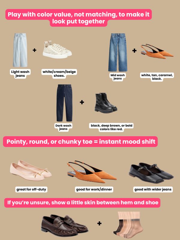 Follow the color-value rule: lighter shoes with lighter washes, deeper shoes with darker washes, and one bold color if you want a focal point. If it feels like too much, keep the shoe neutral and add interest with texture or toe shape instead.