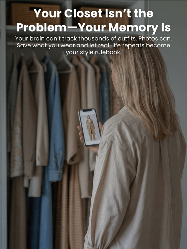 Your closet already contains daily outfit inspiration. You just need to remember it exists. One photo a day builds that memory for you and turns forgotten wins into repeatable defaults.
