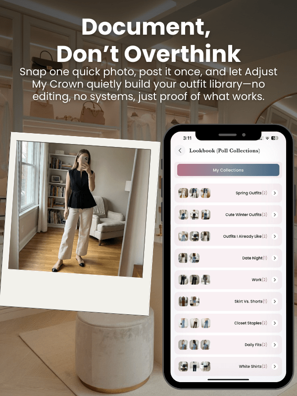 Take the photo before you leave the house. It's just for you, so it doesn't need to be social media perfect. Full-length. Natural light if possible. Mirror selfie or timer photo doesn't matter. Don't edit. Don't pose. Just document. Adjust My Crown auto-saves every outfit you post into Collections, which means your outfit library builds itself. No filing system. No tagging. Just open the app and scroll your own proof of what works.