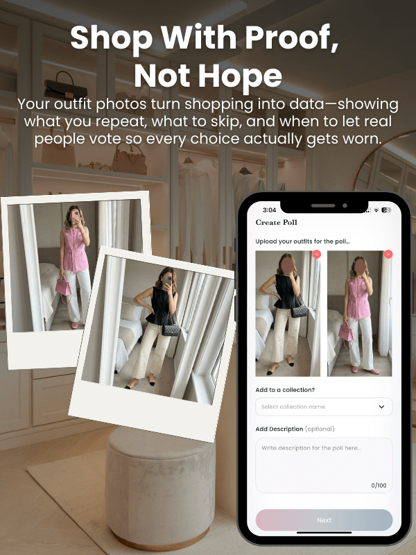 When you're stuck between two outfits in the morning, post a side-by-side poll in Adjust My Crown. Get votes in minutes. Wear the winner. Both are saved to your library.