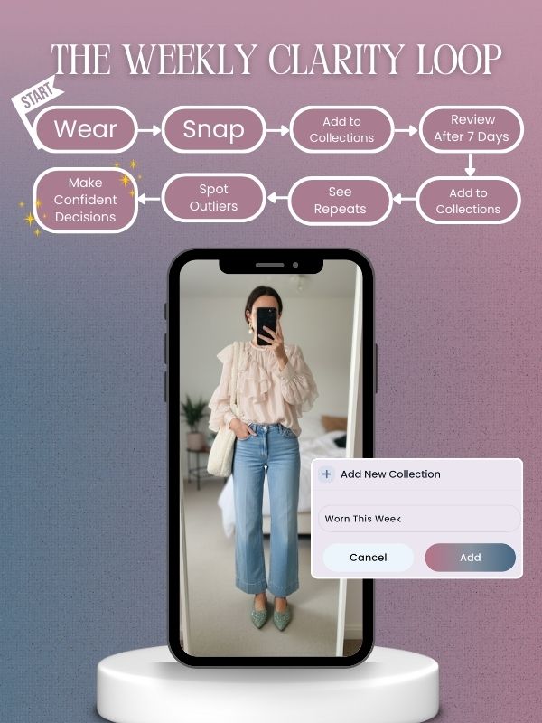 Take one outfit photo a day (30 seconds). Track repeats, winners, and what never makes it out of the closet.