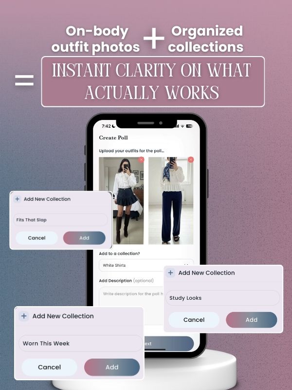 • Built-in polls for decisions – get community feedback on styling choices (belted vs loose, tucked vs untucked)