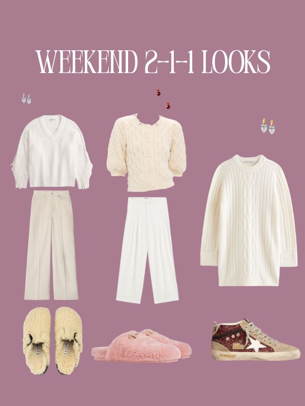 These looks focus on hygge… cozy. Think of the feeling of the inside of your favorite sweatshirt – FUZZY GOODNESS, right? Remind you of your favorite lovie or blankie as a child, no? These are loose and warm and cozy looks that are perfect for weekend, errands, studying, etc. The shoes complete the cozy, relaxed vibe of weekend winter white looks.