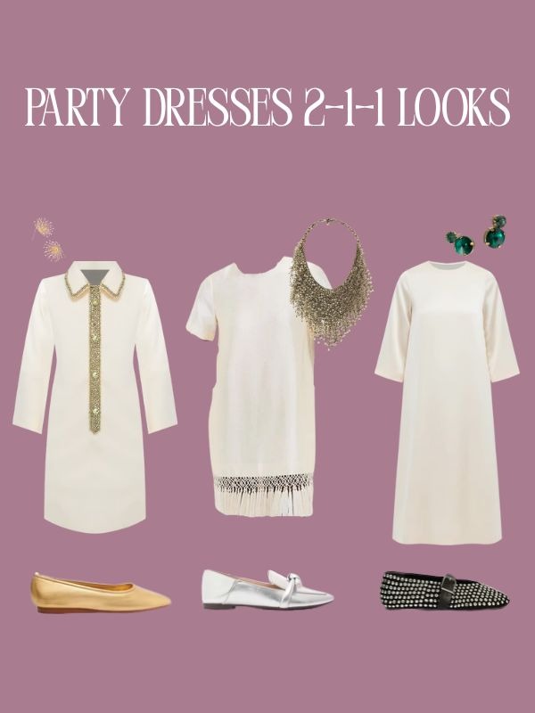 I wanted to show how you can even wear flats for party looks. Comfort means you move with ease and moving with ease is always a better look than an uncomfortable squeeze where you have to remind your face to not show what you’re feeling. The dress on the far right is spectacular on, even though this layflat collage doesn’t show it well. Party dressing means layering on the flair, not wearing uncomfortable clothes.