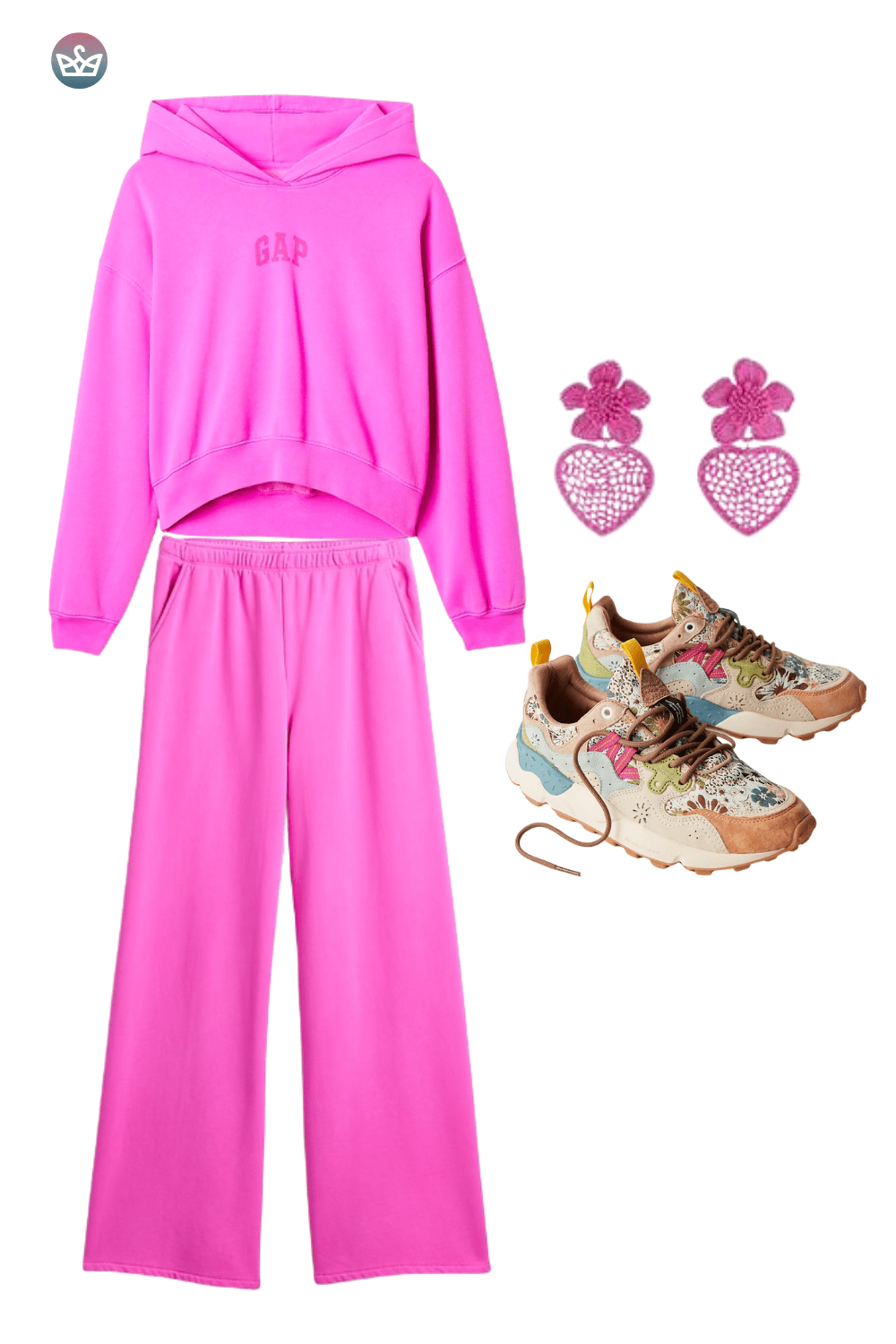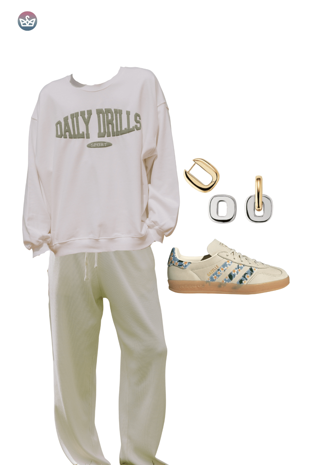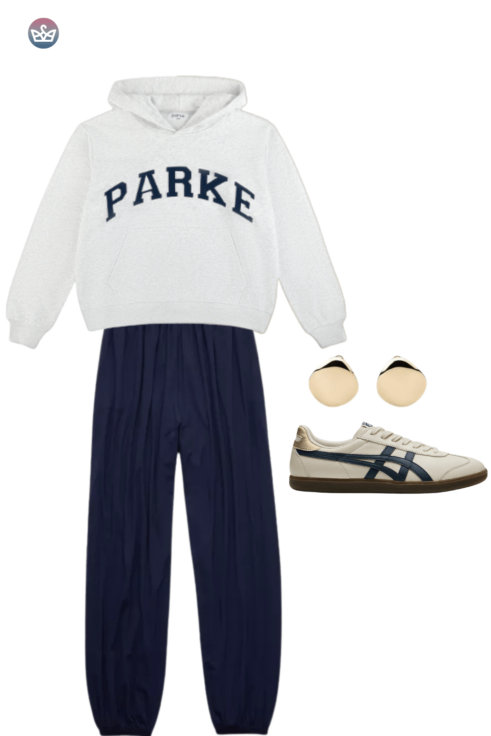 Varsity hoodie + baggy joggers = cozy confidence. Keep it sleek with retro trainers (Onitsuka/Adidas) and toss in cream lounge sets for a tonal, camera-ready library look. Add the Sister Homage hoops on repeat.