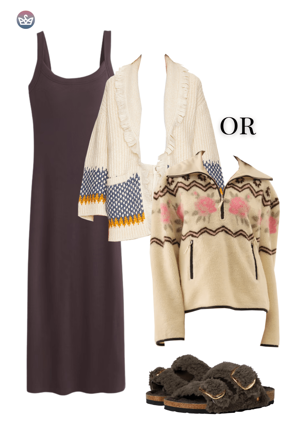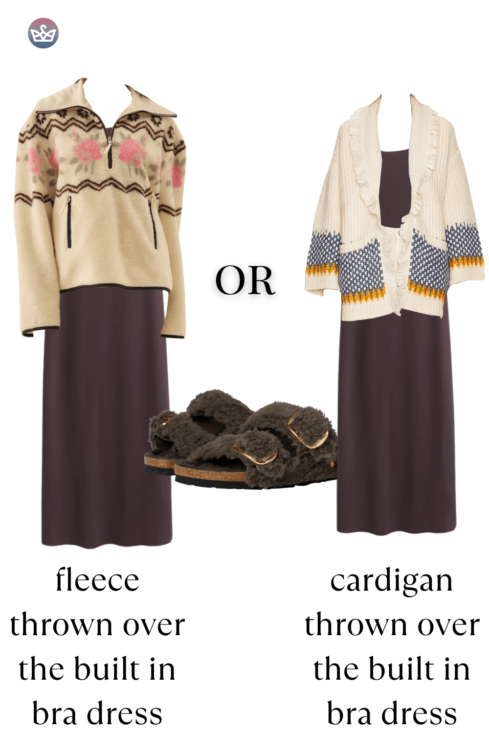 A bra-free rib midi is the fastest Study outfit on earth—throw on, done. Layer a fair-isle wrap cardi or a sherpa pullover for warmth, then slide into teddy Birks for near-silent steps.